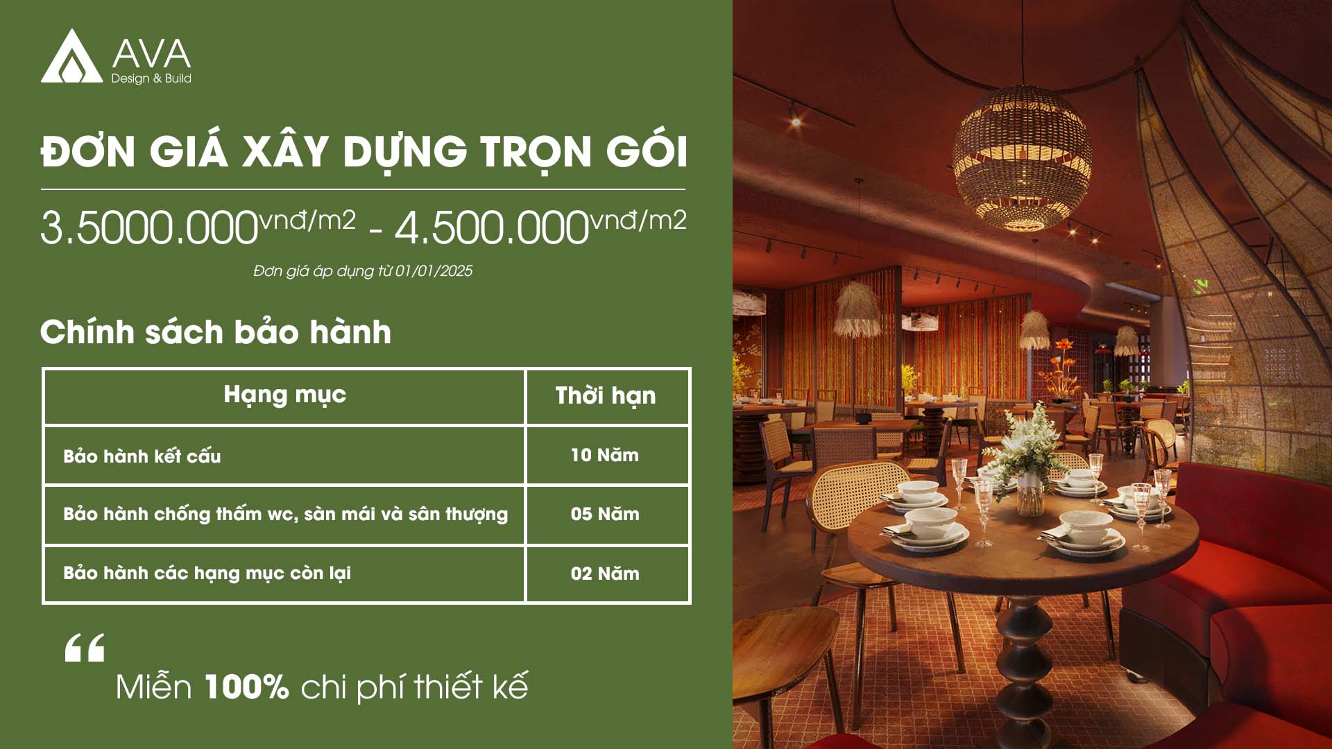 Hiện nay, Công ty Kiến Trúc Xây Dựng AVA cung cấp đơn giá thiết kế nhà hàng chay với đơn giá chỉ từ 250.000 VNĐ/m² cho kiến trúc và 250.000 VNĐ/m² cho thiết kế nội thất nhà hàng chay.