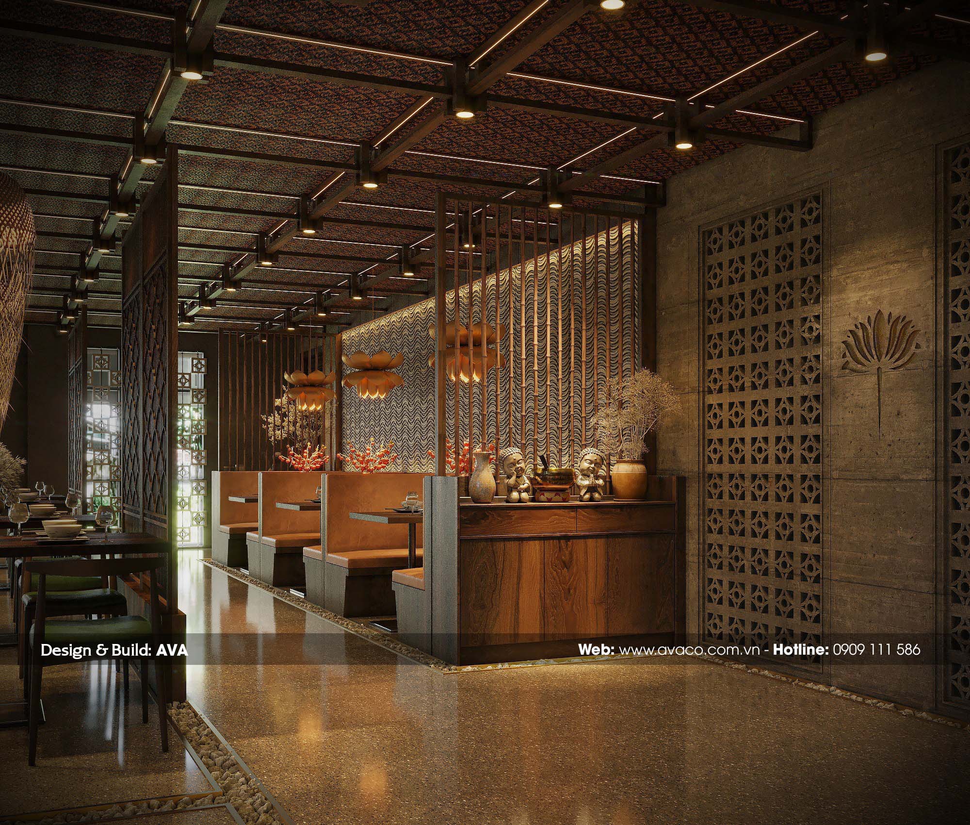 Mẫu thiết kế nội thất nhà hàng chay Diệu Hạnh được xây dựng trên nền tảng của phong cách Á Đông đương đại – sự giao thoa tinh tế giữa ngôn ngữ kiến trúc truyền thống Việt Nam và cái nhìn thẩm mỹ hiện đại, sang trọng.