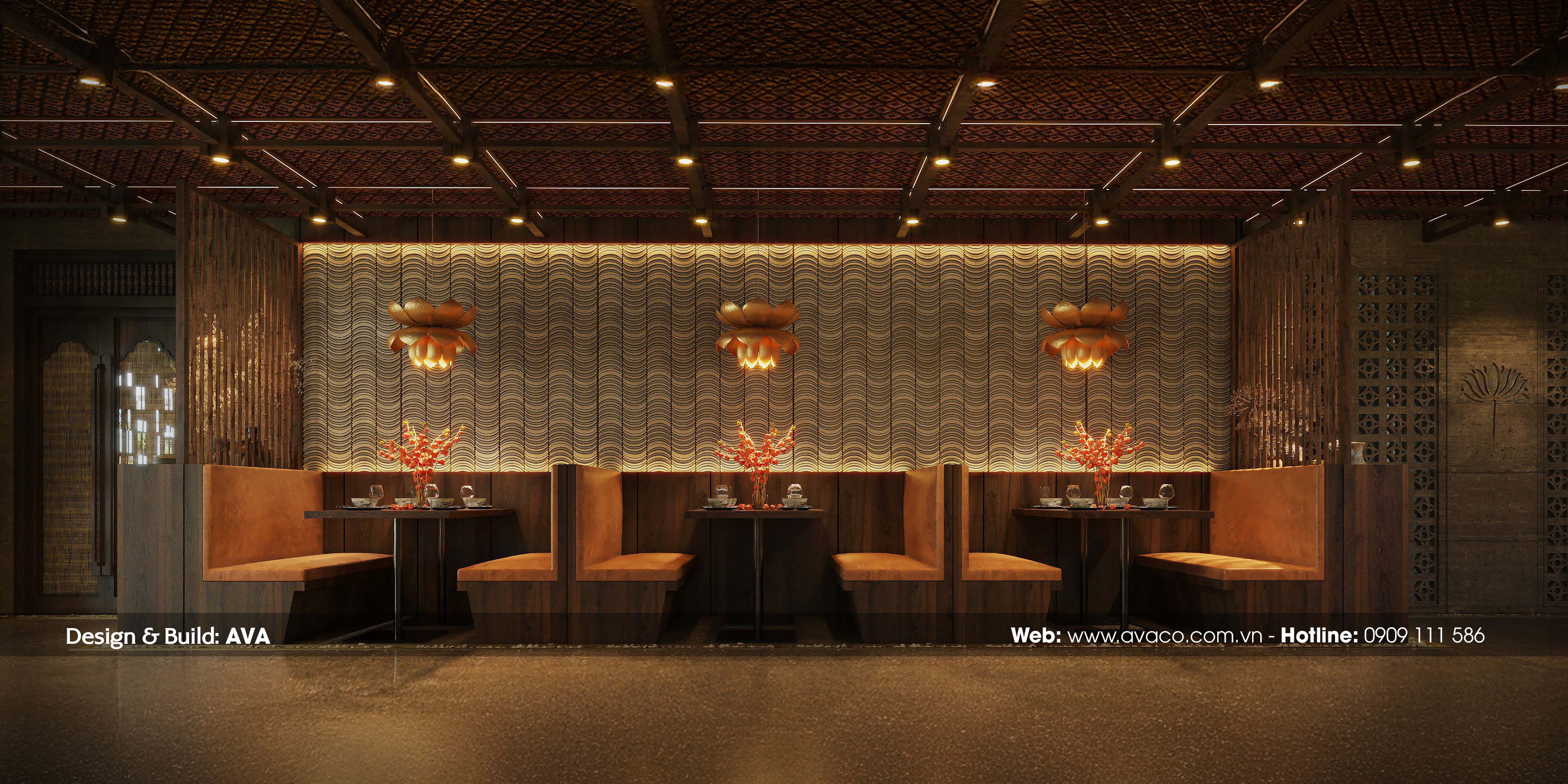 Phương án Diệu Hạnh không rập khuôn theo lối thiết kế cổ truyền, mà khéo léo chắt lọc những tinh hoa Á Đông – hoa sen, mái ngói cong, vách nan gỗ, tranh cành hoa – rồi đặt chúng vào ngữ cảnh hiện đại, tối giản và sang trọng.