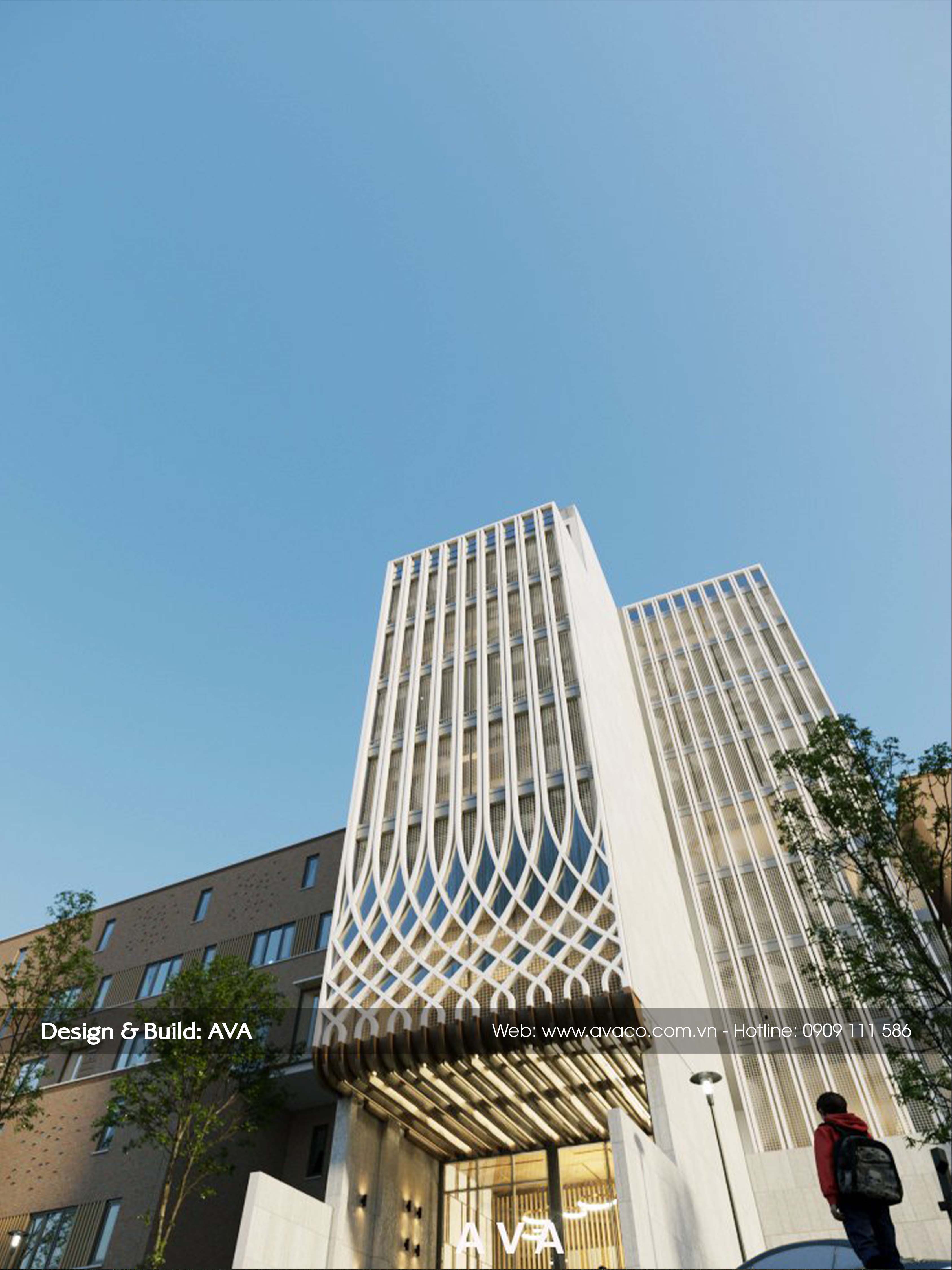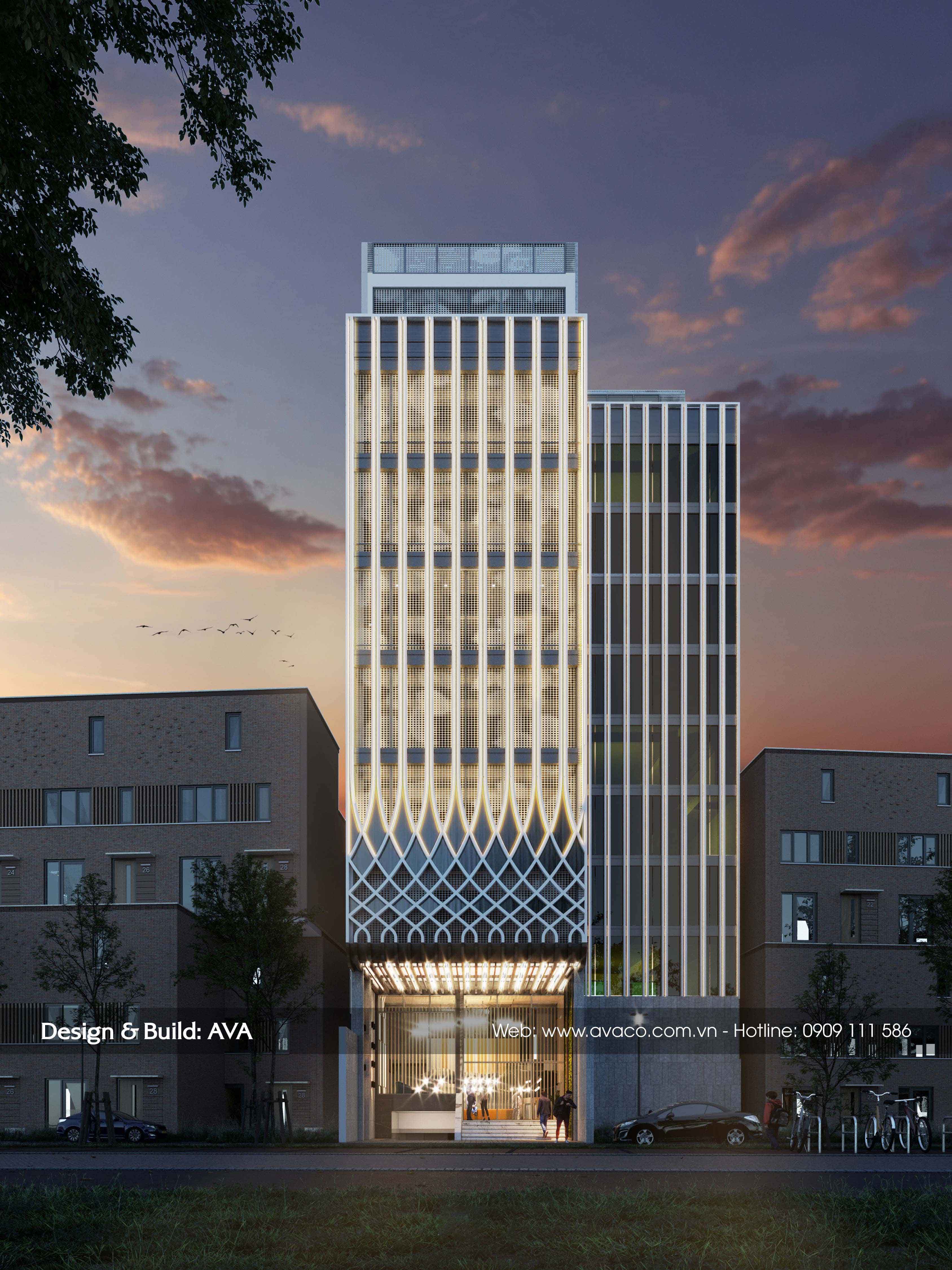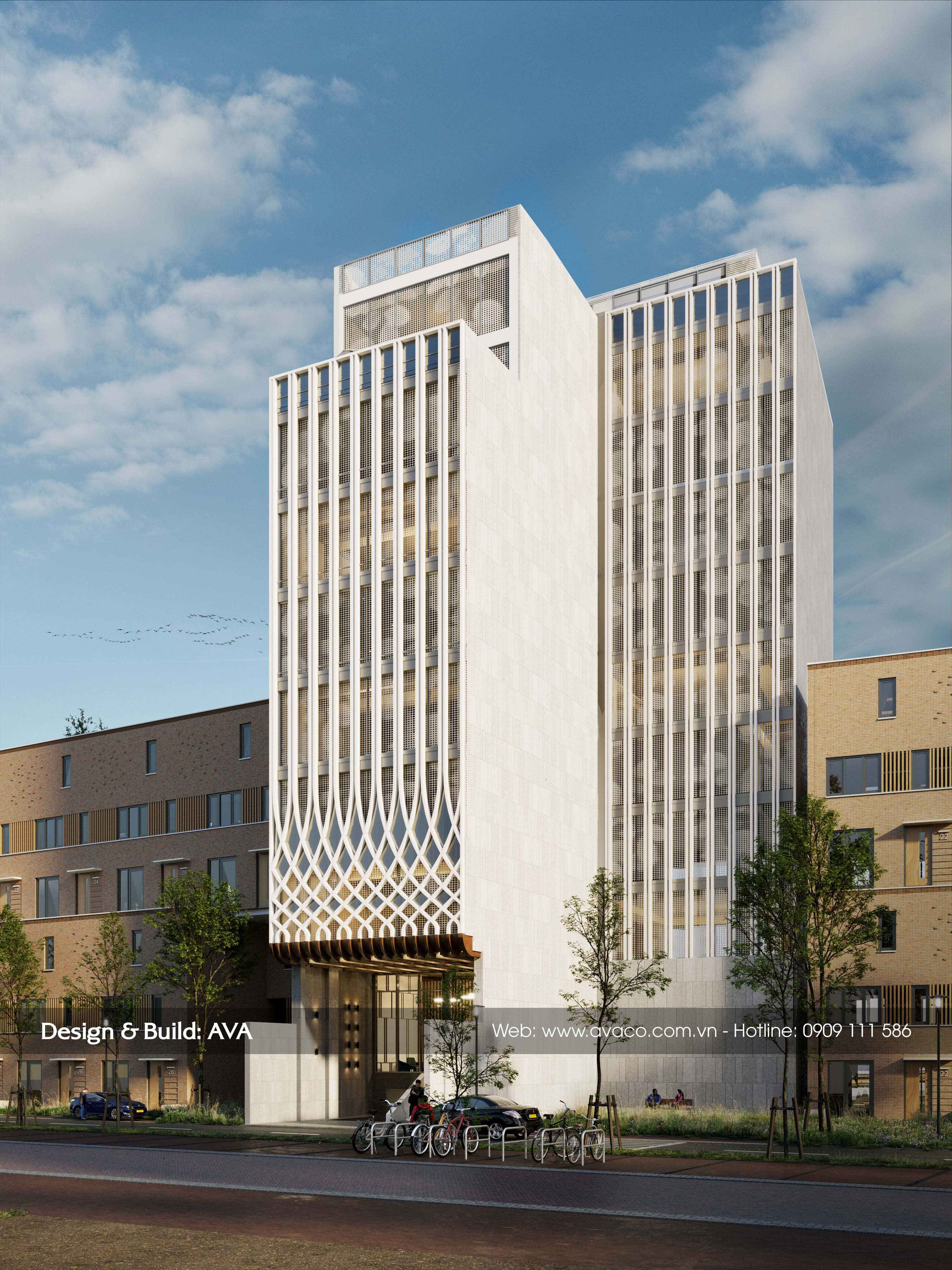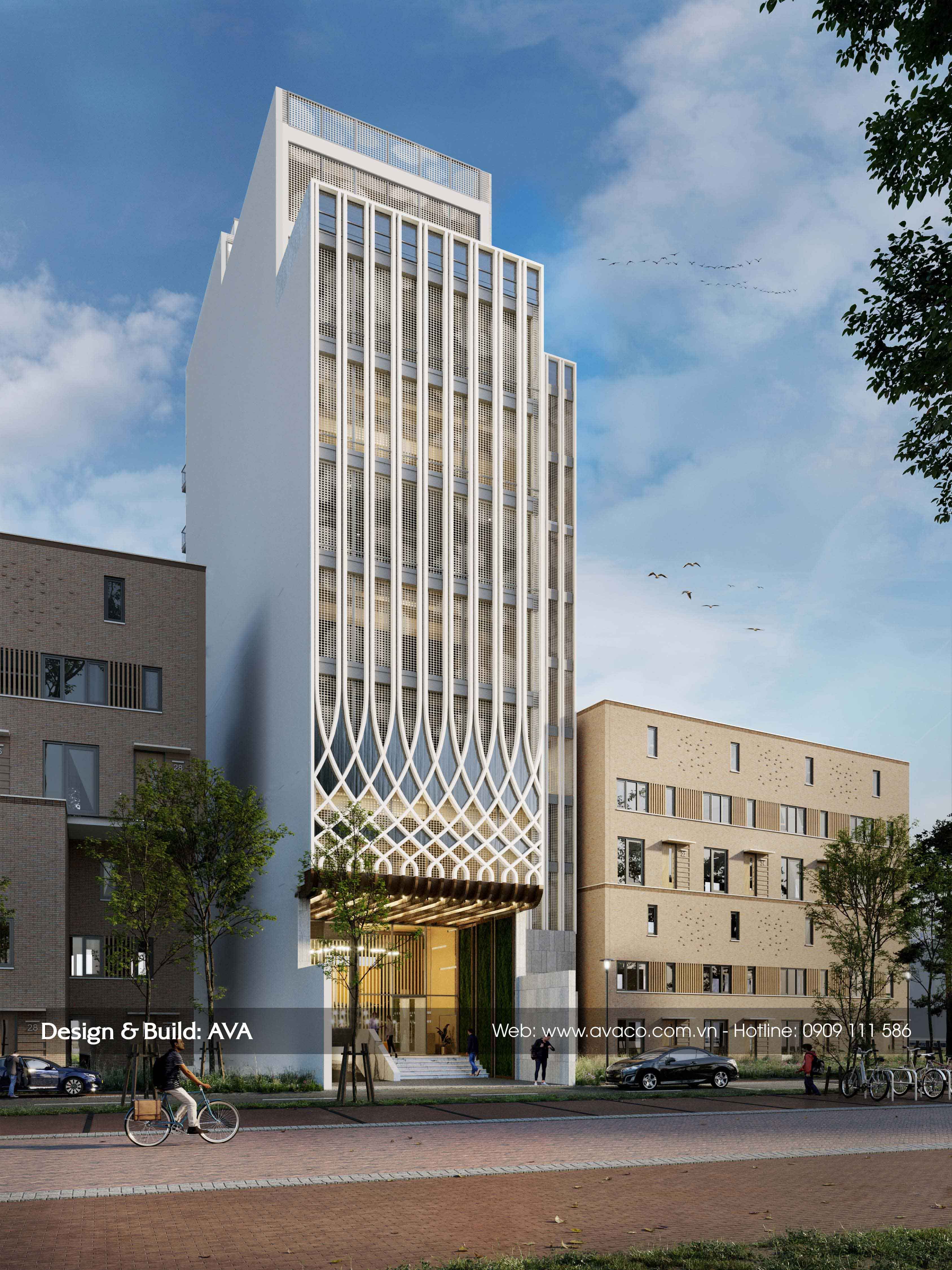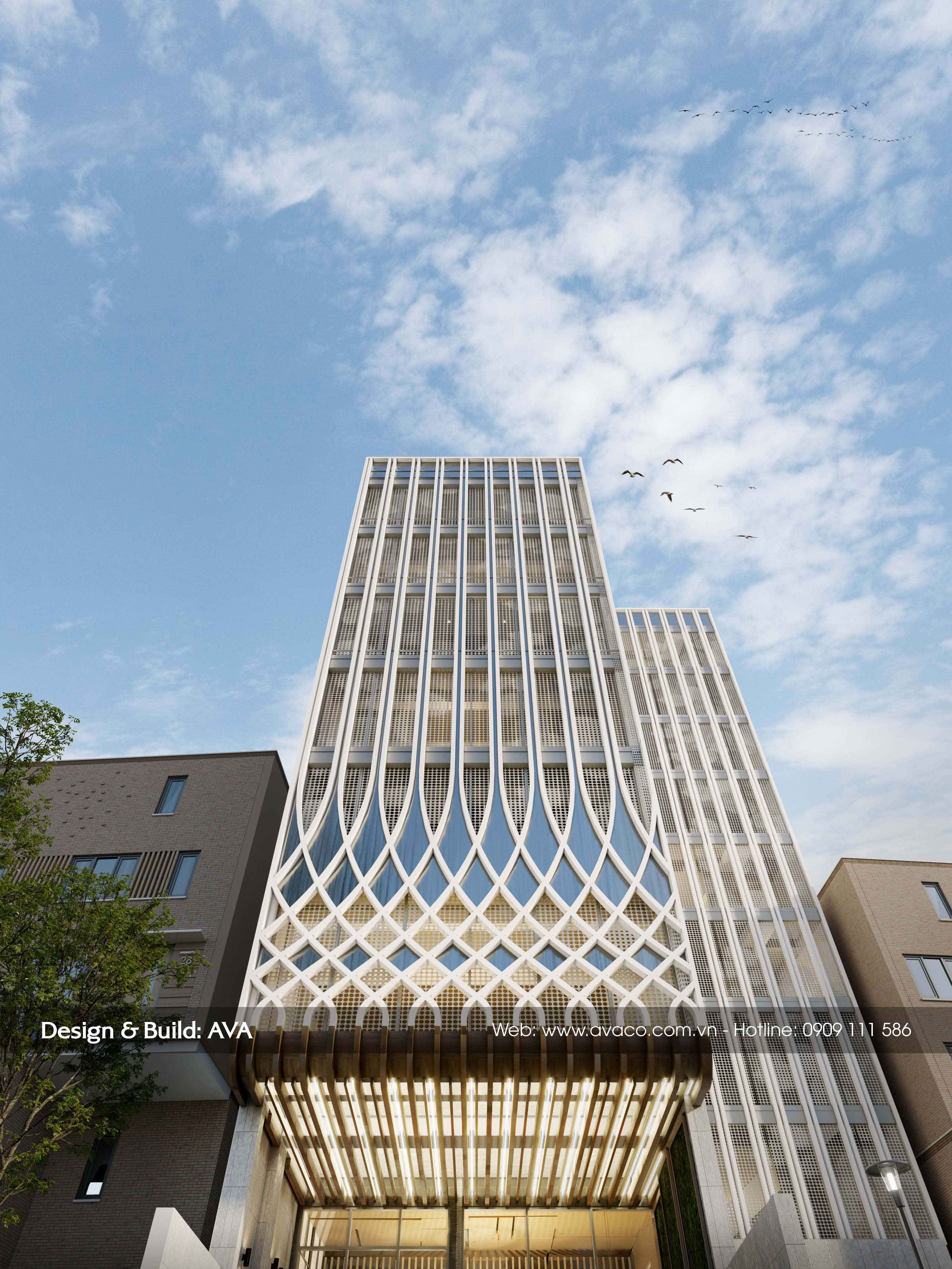 Mẫu thiết kế tòa nhà văn phòng này mang phong cách kiến trúc hiện đại với đường nét tinh tế, sắc sảo, tạo nên một dấu ấn mạnh mẽ cho bất kỳ không gian đô thị nào. Công trình được thiết kế với mặt tiền nổi bật nhờ các chi tiết vân lưới độc đáo, vừa mang tính thẩm mỹ vừa tăng cường hiệu quả che chắn ánh sáng tự nhiên, giúp giảm nhiệt độ và tạo sự thoải mái cho không gian bên trong.
