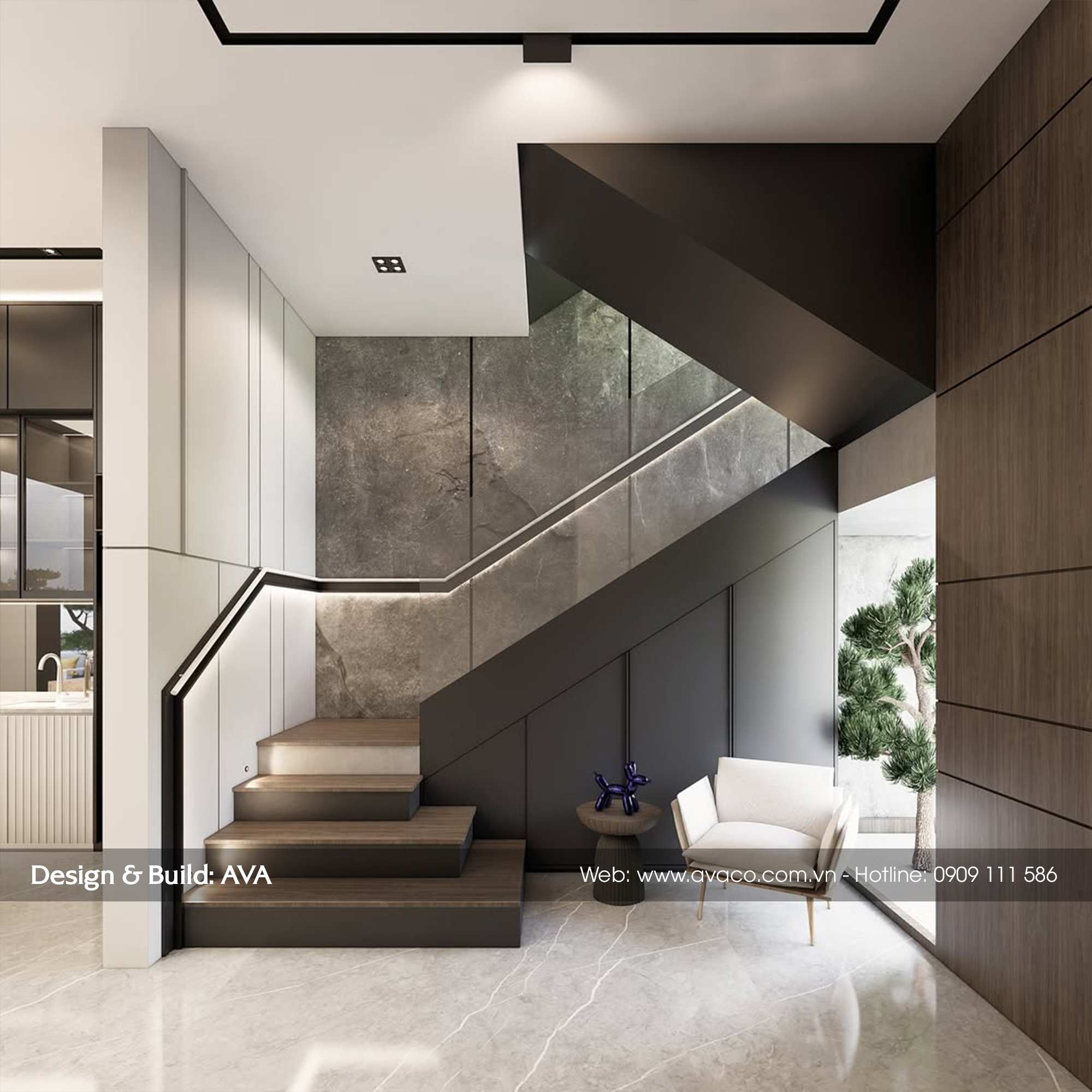 Cầu thang khung đen với bậc gỗ óc chó và tay vịn LED âm là kiệt tác kiến trúc - vừa chức năng vừa nghệ thuật. Bức tường ốp đá tự nhiên vân marble và tường gỗ fluted tạo nền cho cầu thang nổi bật, phản ánh triết lý "vẻ đẹp trong sự đơn giản".