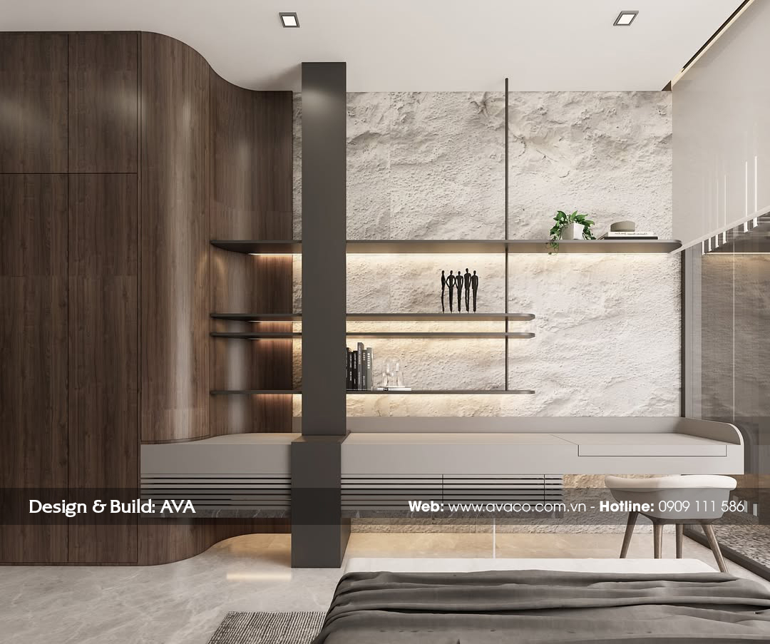 AVA thiết kế hệ thống tủ âm tường cao sát trần kết hợp tủ mở có đèn LED và tủ đóng kín, giúp tối đa hóa không gian lưu trữ mà không làm gián đoạn thị giác. Mọi tay nắm, ổ cắm, rãnh gió điều hòa đều được giấu kín tinh tế, tạo bề mặt liền mạch đặc trưng của minimalism.
