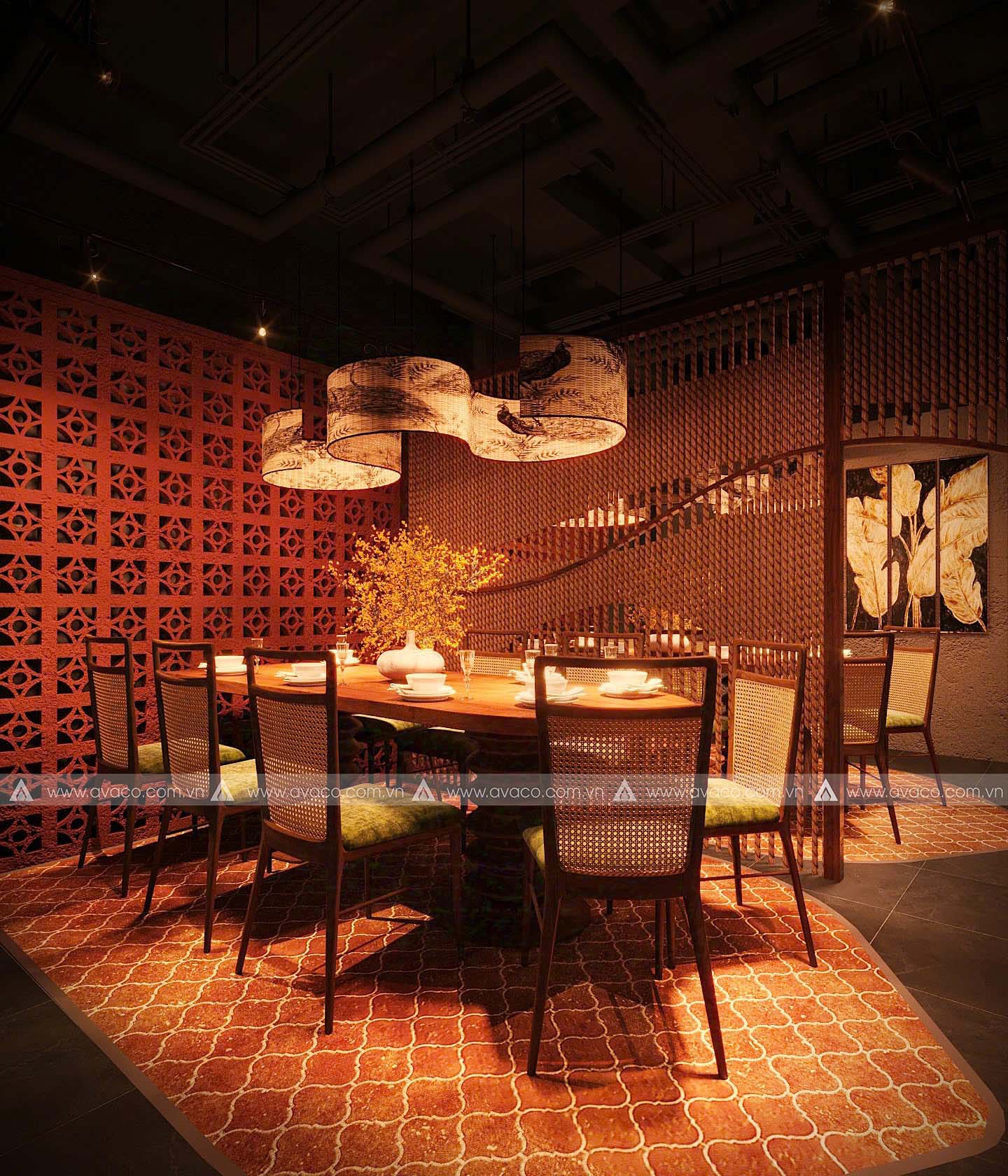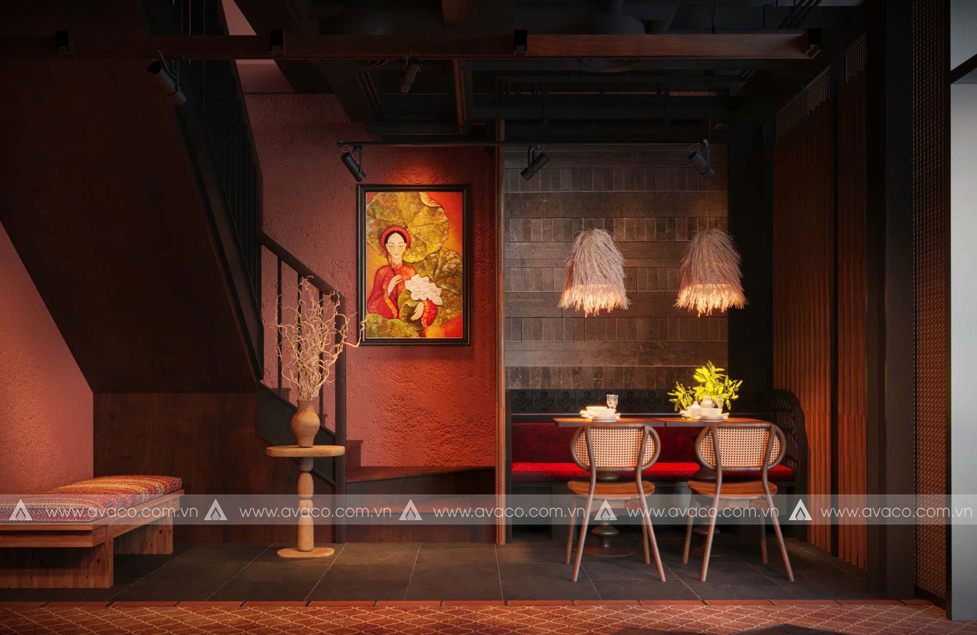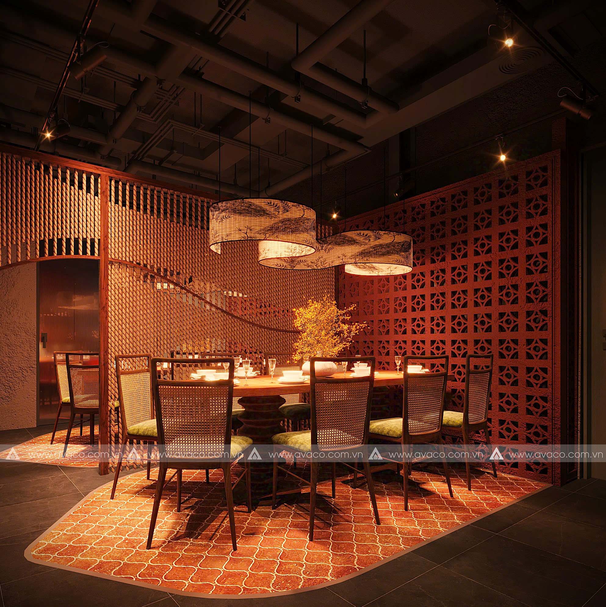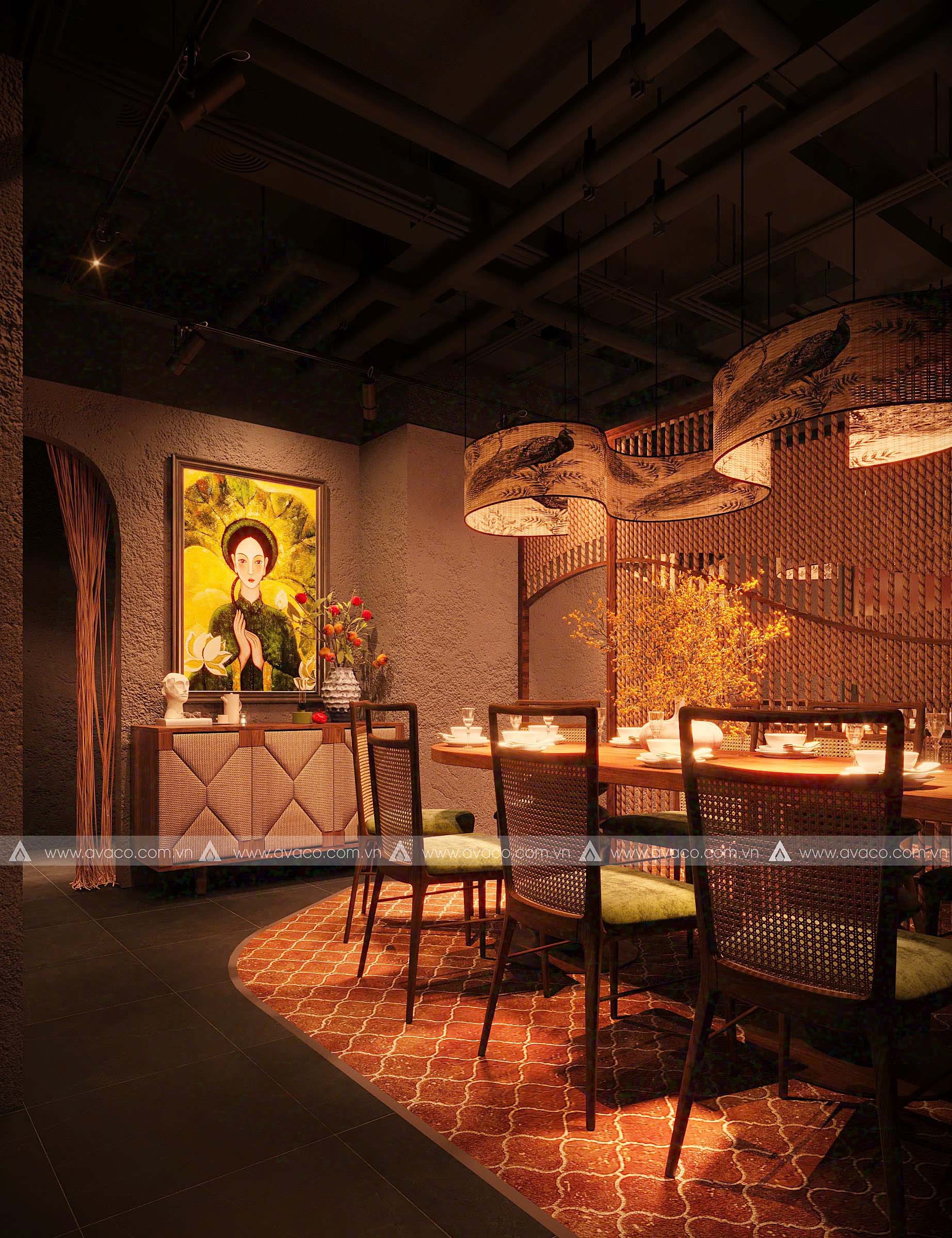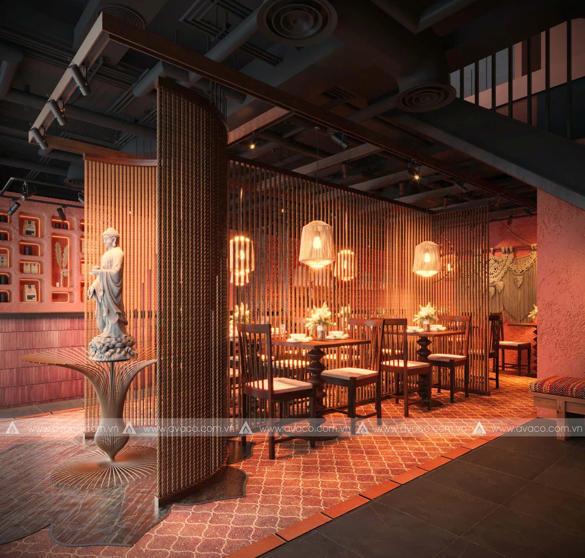 Điểm nhấn của không gian là sự kết hợp hài hòa giữa vật liệu tự nhiên như gỗ mộc, tre, nứa và gam màu trung tính như nâu trầm, xám đá, be nhạt – tạo nên một tổng thể nhẹ nhàng, tinh tế. Các mảng tường thô mộc, hệ thống đèn thả ánh vàng ấm, cùng tranh trang trí lấy cảm hứng từ thiền tông và văn hóa Á Đông, giúp tăng chiều sâu tâm linh cho không gian.