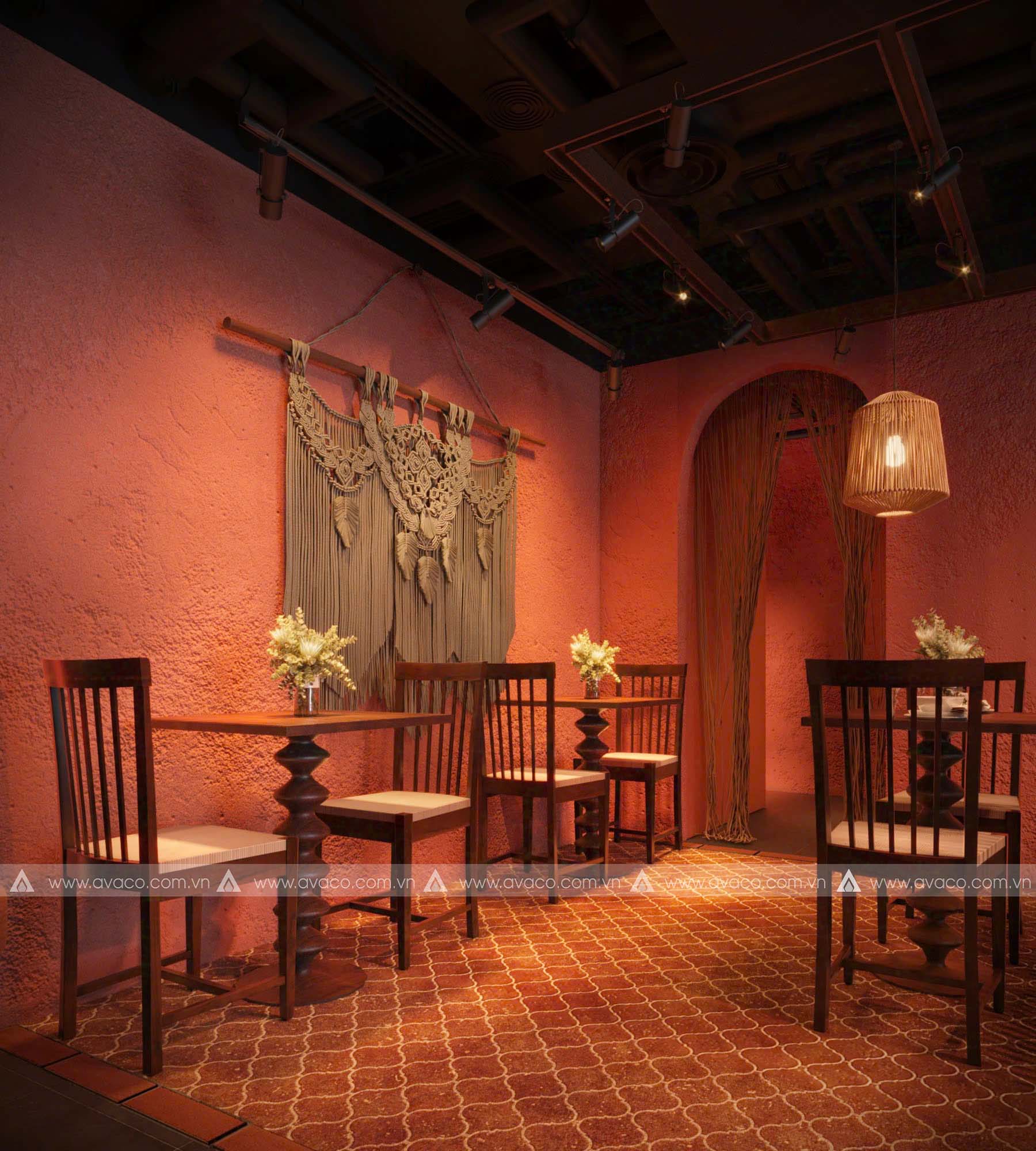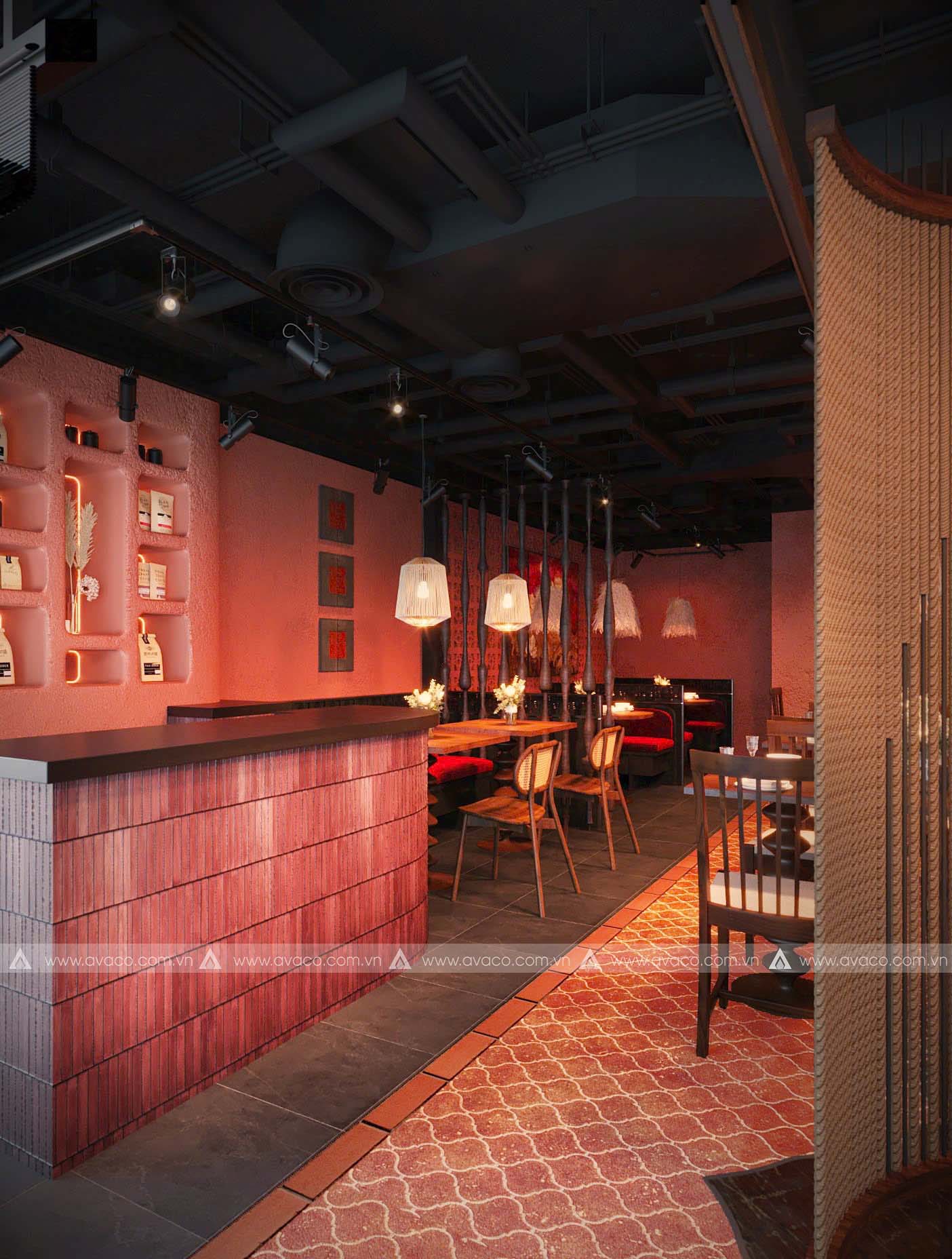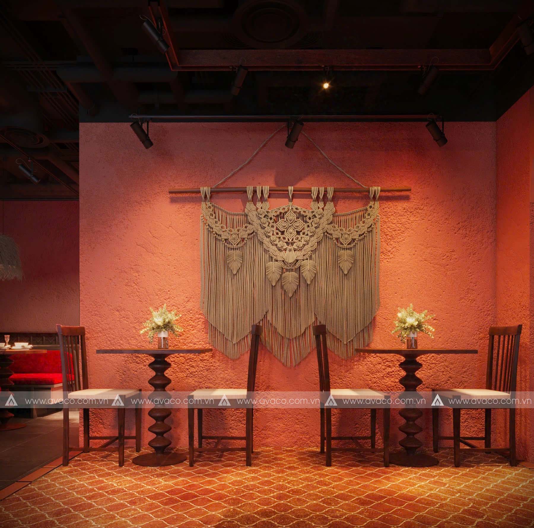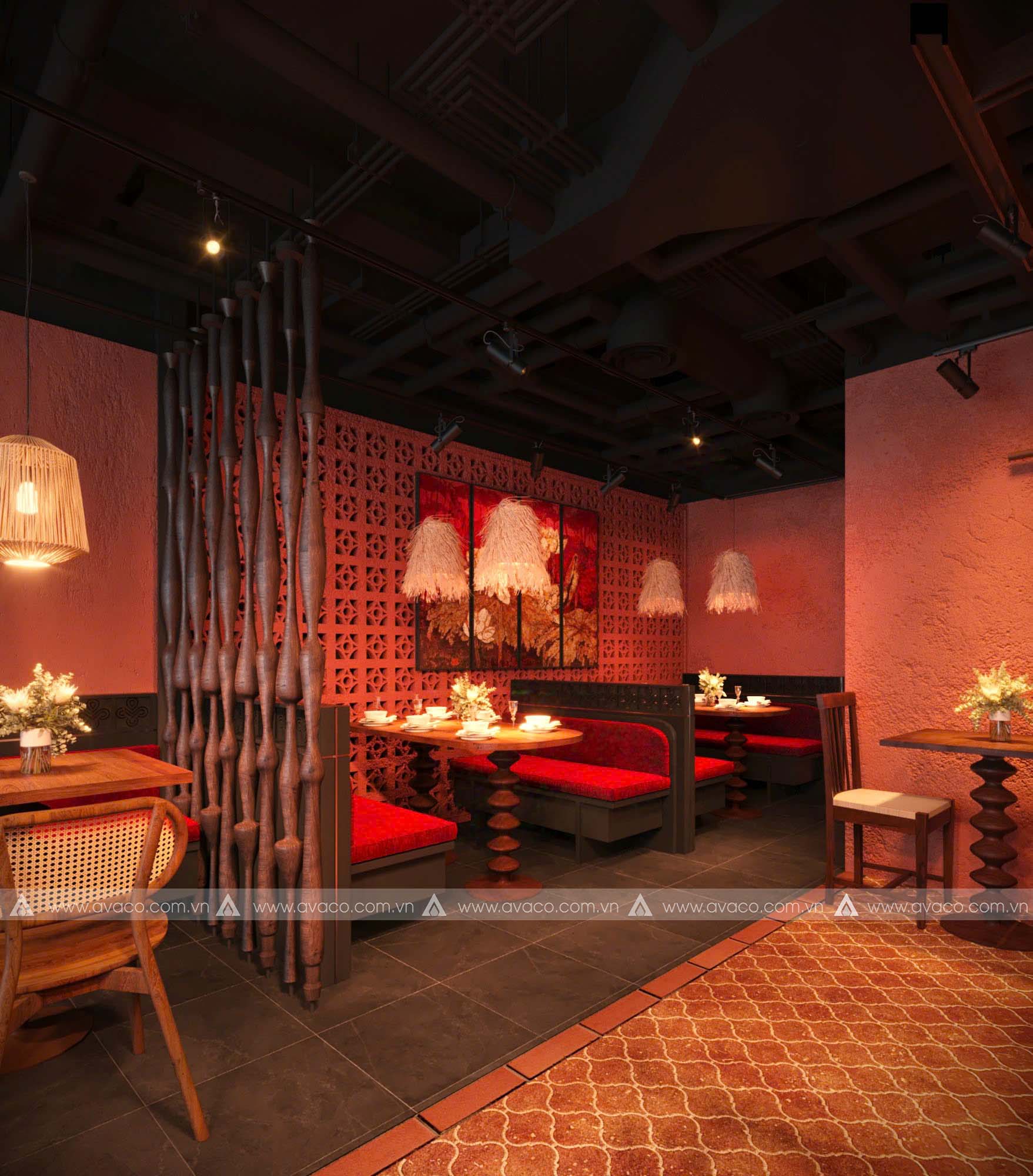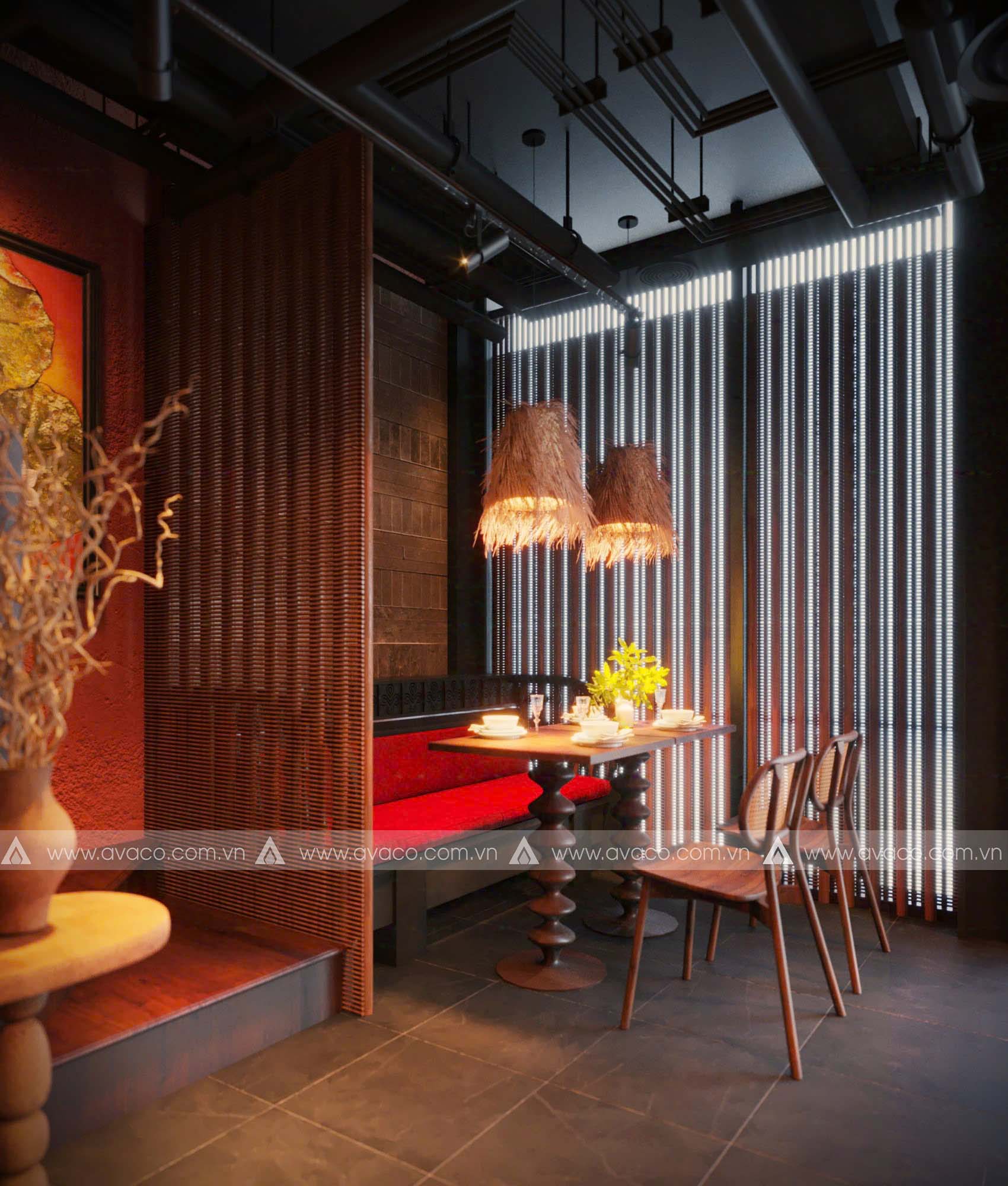 Điểm nhấn của không gian là sự kết hợp hài hòa giữa vật liệu tự nhiên như gỗ mộc, tre, nứa và gam màu trung tính như nâu trầm, xám đá, be nhạt – tạo nên một tổng thể nhẹ nhàng, tinh tế. Các mảng tường thô mộc, hệ thống đèn thả ánh vàng ấm, cùng tranh trang trí lấy cảm hứng từ thiền tông và văn hóa Á Đông, giúp tăng chiều sâu tâm linh cho không gian.