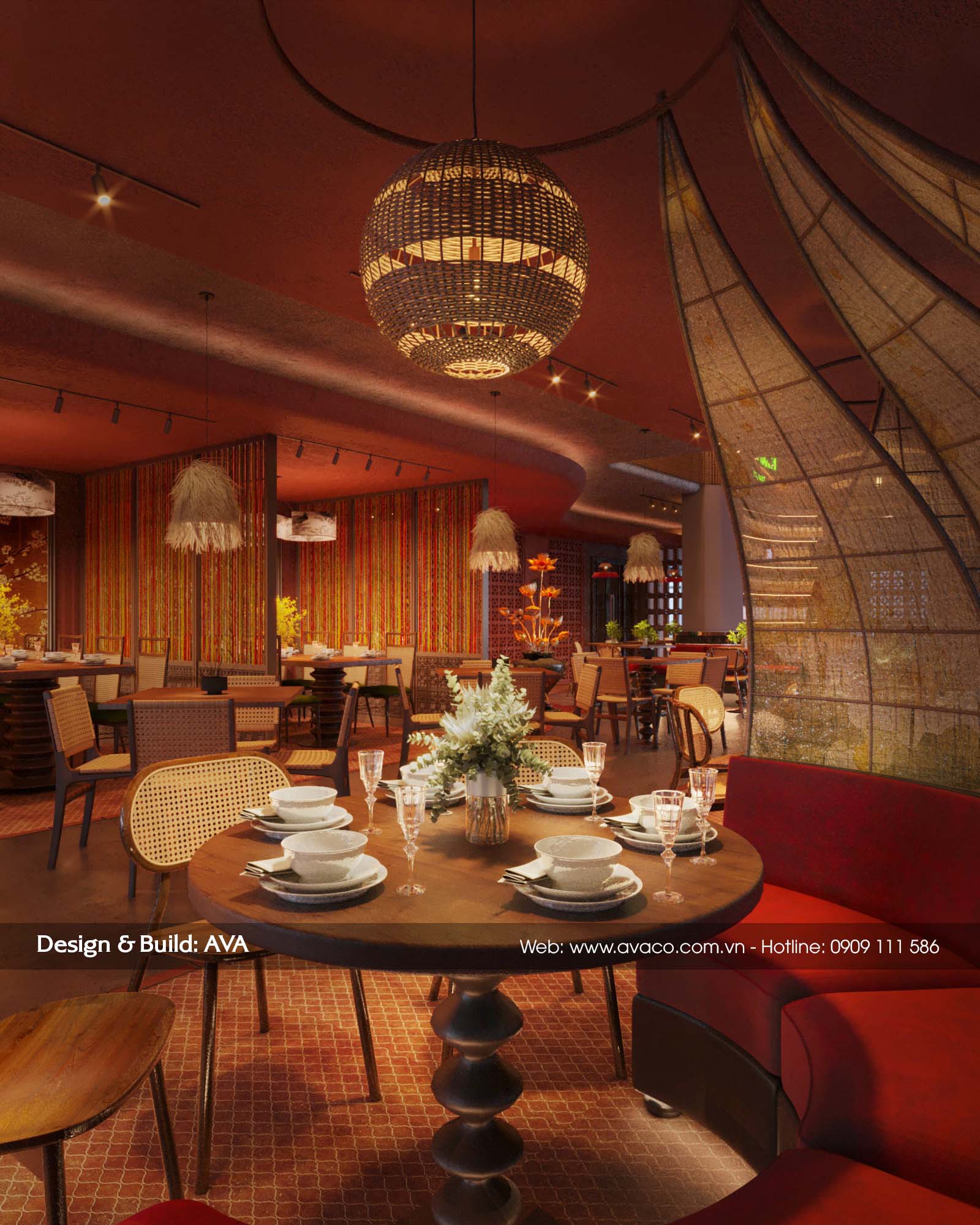 Mẫu thiết kế nội thất Diệu Hạnh lấy cảm hứng từ biểu tượng hoa sen - loài hoa thiêng liêng trong văn hóa Phật giáo Việt Nam. Đường cong mềm mại của trần nhà và vách ngăn tạo nên nhịp điệu thị giác dịu mắt, giúp thực khách cảm nhận được sự an nhiên mà không bị gò bó trong không gian khép kín.