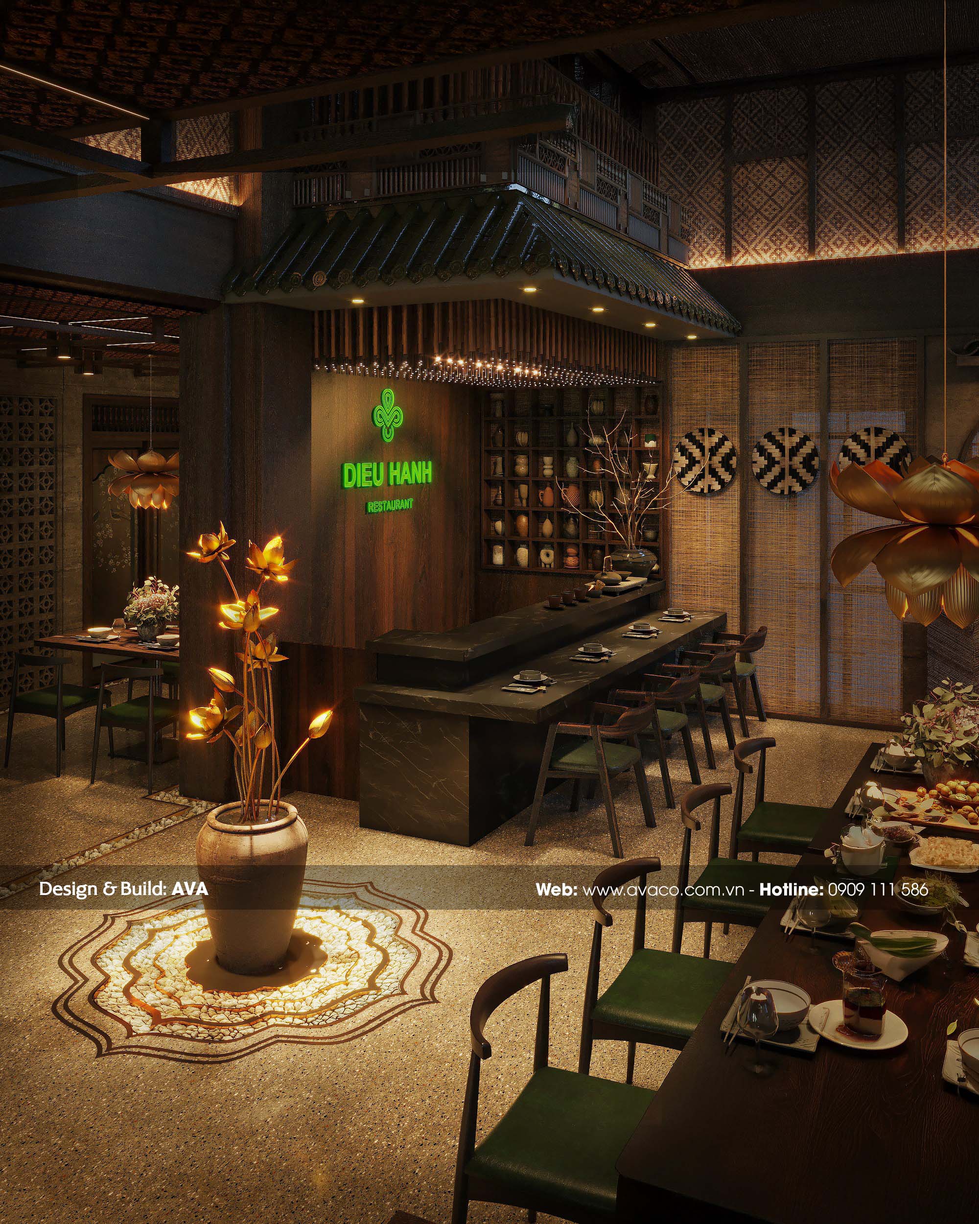 Mẫu thiết kế nội thất nhà hàng chay Diệu Hạnh được xây dựng trên nền tảng của phong cách Á Đông đương đại – sự giao thoa tinh tế giữa ngôn ngữ kiến trúc truyền thống Việt Nam và cái nhìn thẩm mỹ hiện đại, sang trọng.
