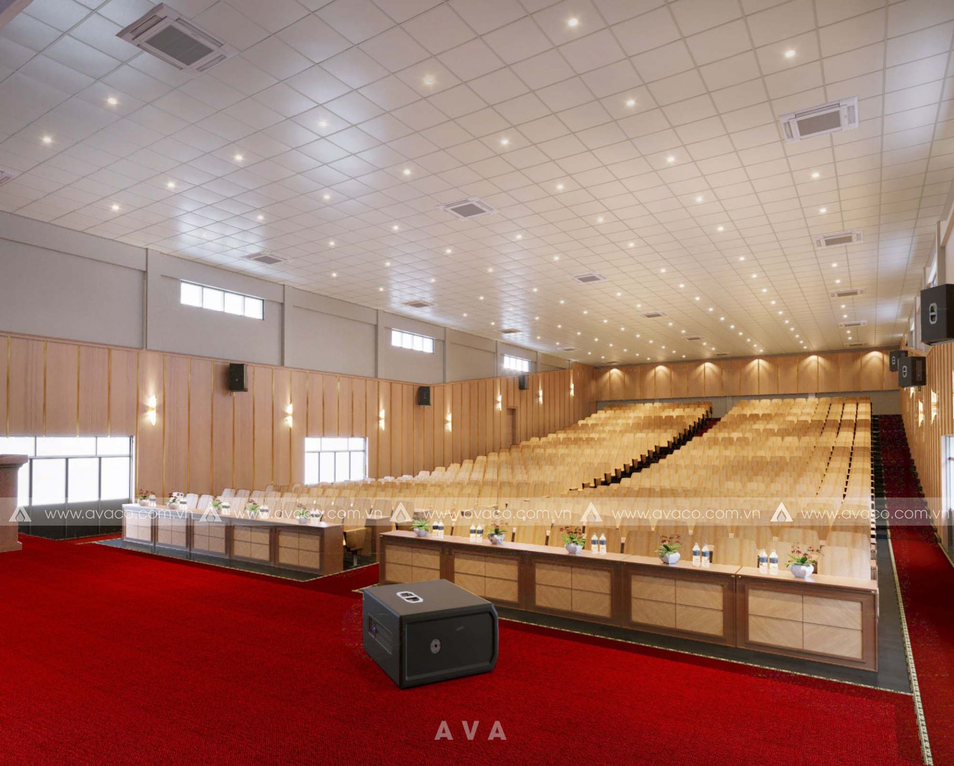 - Âm thanh: Loa công suất lớn, phân bố đều (tường, trần, sân khấu) để âm thanh phủ đều, không bị vang. Cần có micro không dây, bàn điều khiển âm thanh.