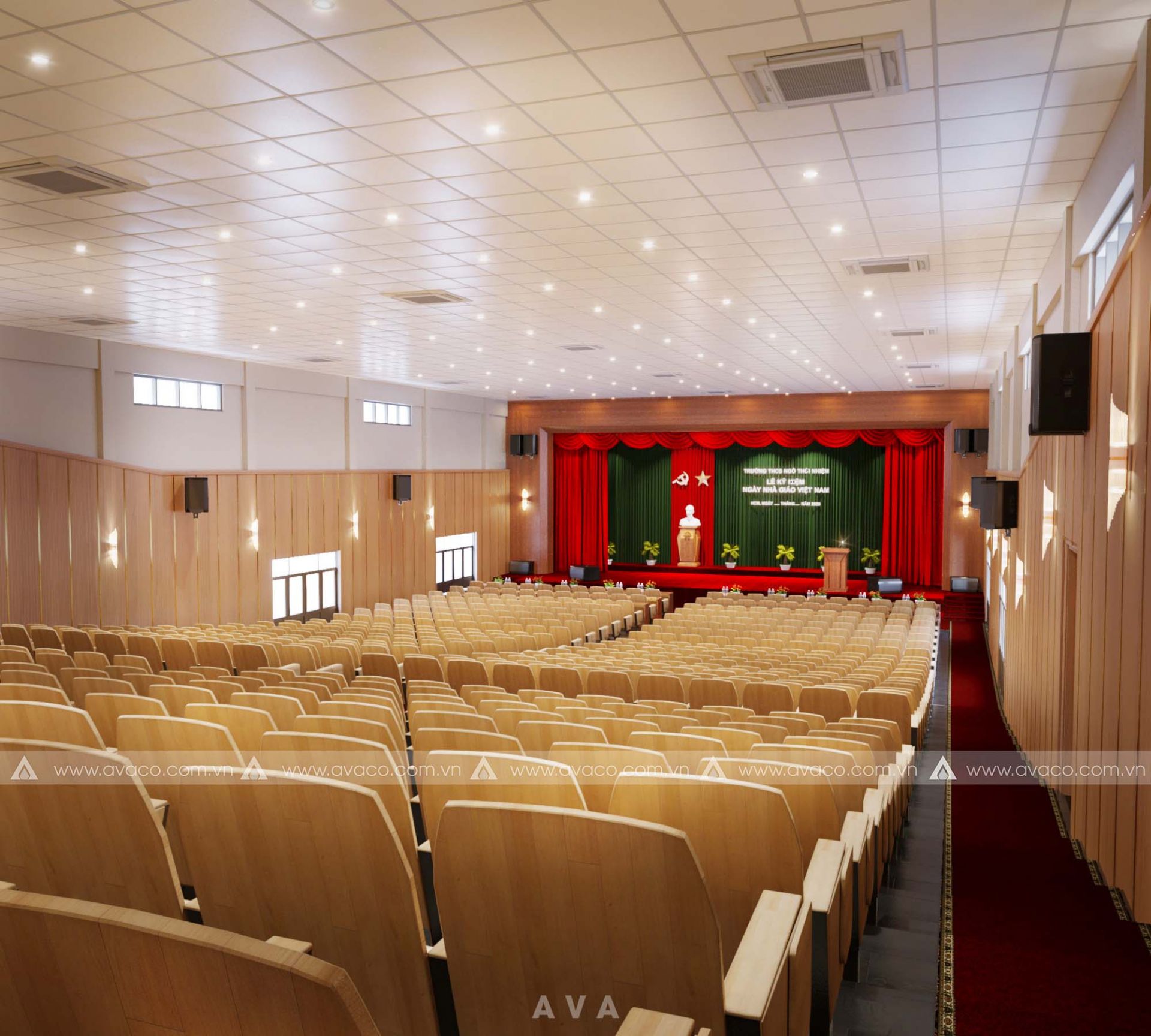 - Trang bị: Rèm sân khấu, phông nền, bục phát biểu, hệ thống đèn chiếu sáng và âm thanh chuyên dụng