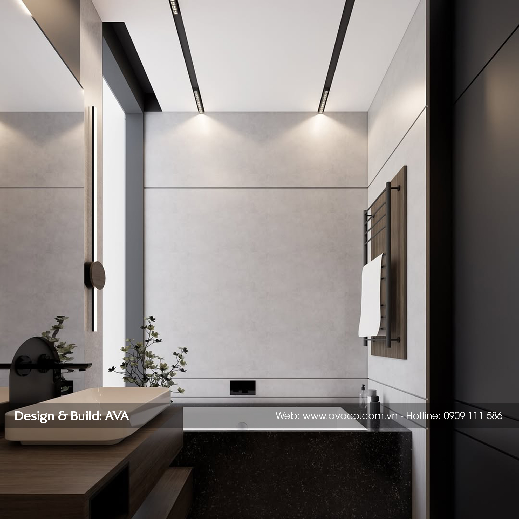 Phòng tắm được thiết kế như một spa riêng tư với bồn tắm đen nổi bật trên nền đá marble trắng xám, tủ lavabo gỗ óc chó treo tường và hệ thống đèn track hiện đại. Cửa sổ nhỏ mang ánh sáng tự nhiên vào, tạo trải nghiệm tắm "zen giữa thiên nhiên".