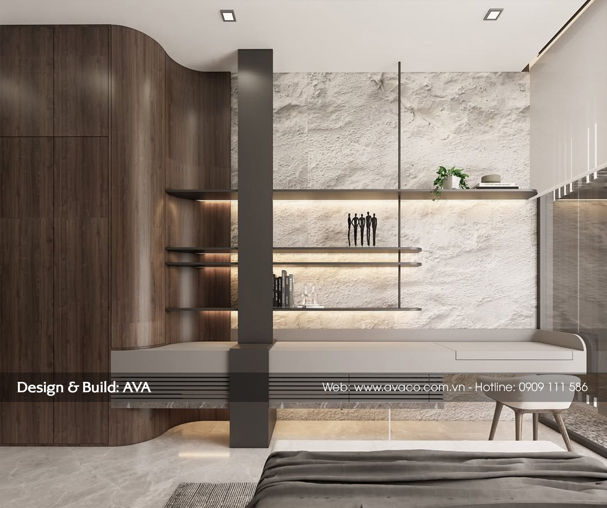 Phòng ngủ chính với đầu giường bọc vải linen sóng gợn màu taupe, tường ốp đá tự nhiên và hệ thống tủ âm tường gỗ óc chó cao sát trần tạo không gian nghỉ ngơi "vừa gọn gàng vừa ấm áp". Ánh sáng tự nhiên từ cửa sổ lớn kết hợp đèn LED âm trần tạo cảm giác "mở và không lộn xộn" - đặc trưng của không gian ngủ Japandi.
