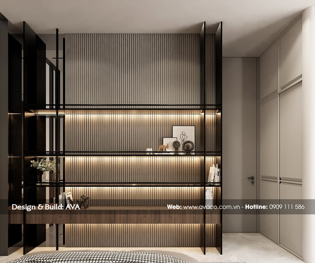 AVA thiết kế hệ thống tủ âm tường cao sát trần kết hợp tủ mở có đèn LED và tủ đóng kín, giúp tối đa hóa không gian lưu trữ mà không làm gián đoạn thị giác. Mọi tay nắm, ổ cắm, rãnh gió điều hòa đều được giấu kín tinh tế, tạo bề mặt liền mạch đặc trưng của minimalism.